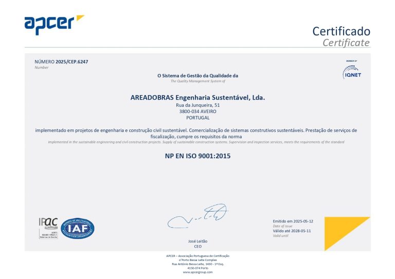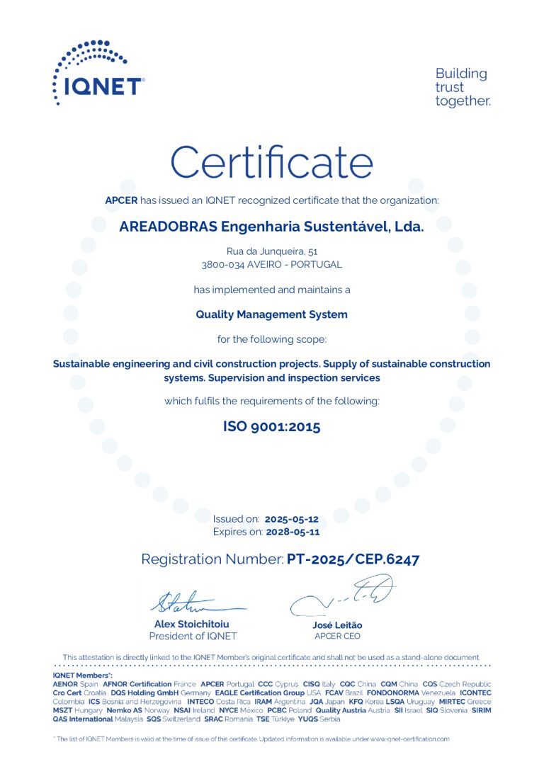 AREADOBRAS – Engenharia Sustentável, Lda. dispõe de um sistema de gestão da qualidade certificado de acordo com a norma NP EN ISO 9001:2015 pela APCER.